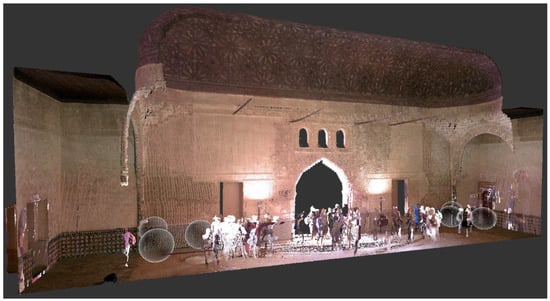 The unpublished graphic representations from the Sala de la Barca displayed in this paper have originated starting from the data captured by a BLK360 laser scanner (Leica, Heerbrugg, Switzerland), with an accuracy of 6 mm at a 10-m distance and 8 mm at 20 m. The complete point cloud was levelled using a total station Leica TS02 (Leica, Heerbrugg, Switzerland) with 3’’ angular accuracy and 1.5 mm ± 2 ppm distance accuracy. The scanning process focused on the muqarnas area, although in every scan, station data of the complete 360° volume were also registered. For this reason, every scan displays floors, walls, decorations, pillars, columns, and doors. Simultaneously, to every scan we took HDR (high definition resolution) pictures with the scanner cameras [18].