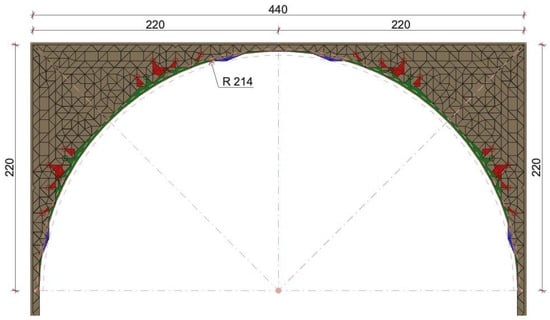 The transition circumference between the pendentive and the dome arc requires a detailed study. There are three ways to trace the arc: (1) an outer arc with radius up to the bisectors intersection from the corners to the inner of muqarnas and that cross the manifold adarajas (this solution deforms the muqarnas); (2) an inner arc touching four points in the muqarnas set that would consequently stretch the muqarnas; and (3) an intermediate arc with a 2.14 m radius shown in Figure 13 where we can see irregular areas: in the blue areas the muqarnas should be compressed to match the arc, and in the green areas, the muqarnas should be stretched to fill the holes and achieve the arc.