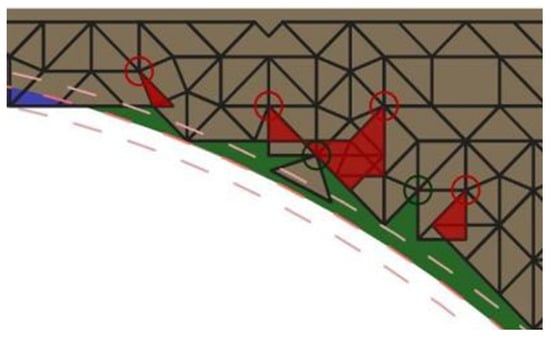 Comparing the above-mentioned drawing inconsistencies with current photos we observed that the drawing was not wrong, i.e., the drawing deformations seem to match to the real ones. After analyzing the Jones’s drawings, we established a starting hypothesis in order to interpret our own drawings: the muqarnas were deformed from their conception to their construction. To verify our hypothesis, we identified the muqarnas pieces in both the photos and the point cloud, and we tried to draw the ideal plan following the geometric grouping rules (Figure 12) without the real deformations existing in the room. We observe that fitting the pieces is an impossible task: in some points there are coincident pieces with both overlapping and hole angles as shown in Figure 12 and Figure 13 marked with red and green circles, respectively; this means that it is necessary to deform such pieces to avoid both the overlapping and holes, shaded by red and green areas, respectively, in Figure 12 and Figure 13.