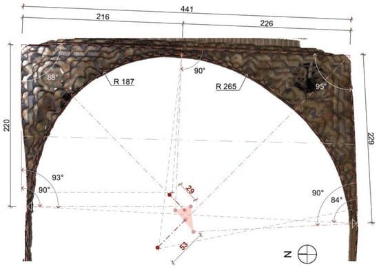 We also detected that the upper arc, where the pendentives end up, was not a sole arc. The point where both pendentives assemble was not in the hall center; it was located 216 cm from the northern wall and 226 cm from the eastern one (Figure 14); for this reason both pendentives were inscribed inside arcs with different radius: the southern pendentive had a 265 cm radius and its center was displaced 53 cm from the ideal place; and the norther pendentive had a 187 cm radius and its center was displaced 29 cm.
