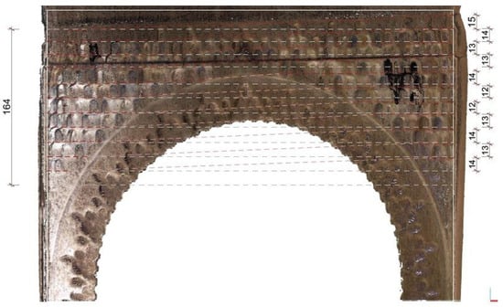 Finally, a cross-section of the hall showing certain deformations was elaborated. Figure 15 shows marks of the starting points for each muqarnas level with a line connecting their lower parts. Thus, horizontal lines were used as references for measuring the heights. The pendentives were composed of 11 levels, each level was close to 15 cm height, and the total pendentive height was 164 cm in the northern side. Comparing the reference lines and real construction, we observe that the vertical displacement ranged from 13 to 15 cm. A hypothetical explanation is the subsidence of the northern wall that was closer to the extremely overweight Comares tower (Figure 3) while the southern wall supports the frame weight.