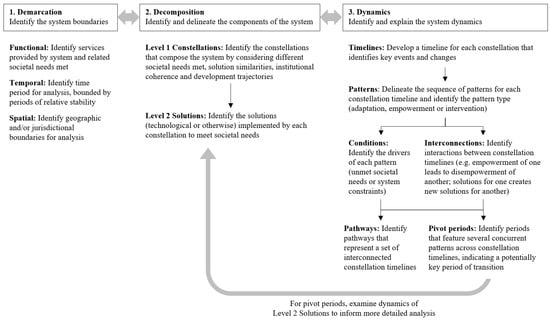 Pathways have become a central notion in various areas of research, amongst which are the studies of transitions to sustainability. Though various typologies and concepts are available, a framework for systematic analysis of transition pathways is lacking. We present the Multi-Pattern Approach (MPA) to fill this lacuna and provide a step-by-step manual for its application. The MPA addresses a range of traditional challenges of transitions’ pathway analysis, such as temporal and functional system demarcation and the unravelling of complex, interrelated systemic storylines. The approach provides an oft-called for rigour which allows a diagrammatic and formulaic representation of transitions’ pathways. Because of these qualities, the approach allows systematic cross-case comparison and provides a bridge between narrative-based and computational transitions research. The approach is demonstrated with an in-depth empirical case study of water management in Melbourne, Australia over the last 180 years. The article first presents a high-level mapping of the system’s evolution over time and a detailed analysis of the uptake and phasing out of specific servicing technologies and practices.