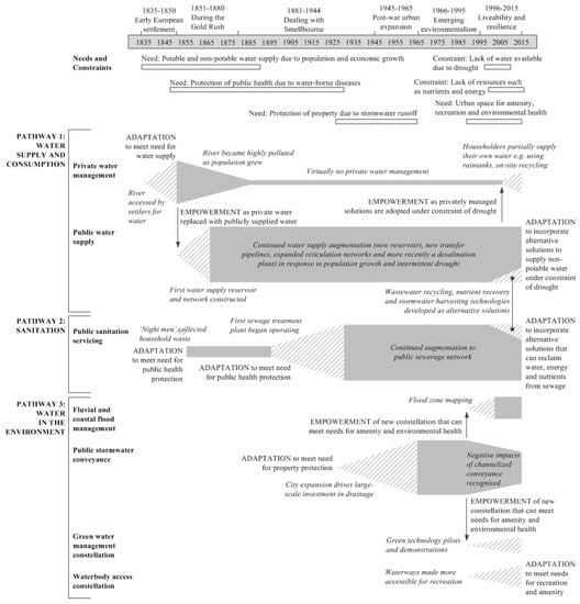 The story of Melbourne’s water system has evolved over the last two centuries since the first arrival of Europeans in response to emerging social, political, climatic, ecological and economic drivers. This evolution has been characterised by steady and then accelerated population growth, economic fluctuations, periodic drought and growing community aspirations for a clean, healthy urban environments. Significant infrastructural and institutional changes have resulted for the water system—over time, new system services have been added and the approach to deliver some of those services have been adapted. These changes are particularly marked since 1995 when pollution control was given greater priority and the city experienced extended drought. A commitment to integrated water cycle management and liveability outcomes emerged over this period, enabled by the integration of decentralised and nature-based technologies with traditional centralised infrastructure [27,40].