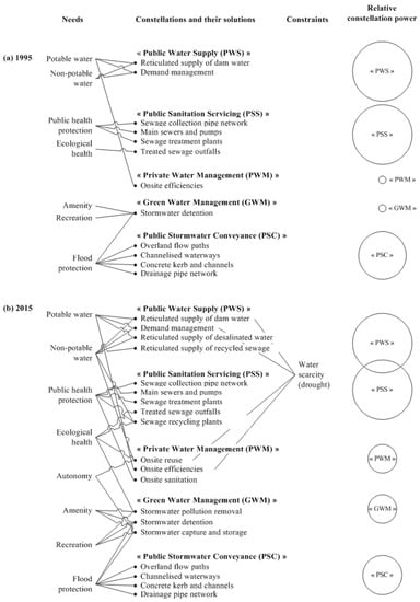 System configuration of Melbourne’s water system in (a) 1995 and (b) 2015 to support detailed MPA analysis. A line between a need and a solution indicates that the solution meets that need. Similarly, for the constraint and solutions. The sizes of circles around the constellation names are indicative of their relative power.