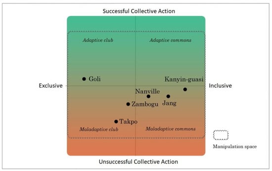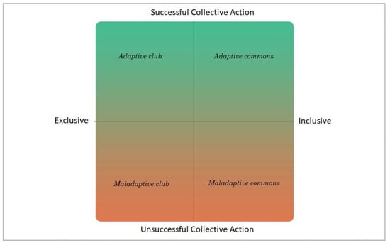 - The last scenario are ‘adaptive commons’ that both include a variety of users and tend not to rigidly exclude certain groups, while collective action is likely. This scenario is perhaps most desired to achieve by adaptation interventions because it is likely to be the most sustainable and equitable.