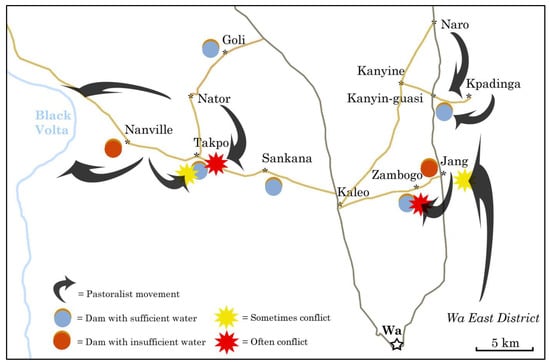 - Fielmua, N.; Bandie, R.D.B.; Ziemah, M.K. Managing Pastoralism and Water Rights in the Upper West Region of Ghana: A Blame Game among Actors. J. Sustain. Dev. 2014, 7. [Google Scholar] [CrossRef]
