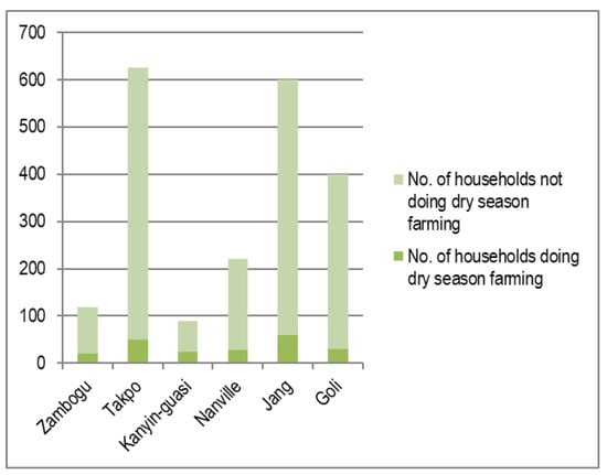 Dry season farmers: numbers and crop usage: Only small groups of people in the communities do dry season farming. Ranging from 21 to 60 households, the dry season farmers are estimated to range from only 8% up to 31% of every studied community. While the number of household per community highly differ, from 625 in Takpo to around 80 in Kanyin-guasi, the number of dry season farmers per community are less diverse (from 21 to 60 households, visualised in Figure 4).