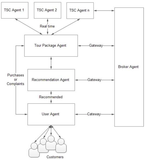 It is evident that conventional software or traditional methods employed in the tourism industry for selecting tour packages aren’t suitable for smart tourism [29,59] due to issues in real time data communication, real time customization and suitable recommendation filtering approach, which leads to unsatisfied customers by recommending unacceptable tours [8,21]. To respond to the aforementioned challenges and issues, it is imperative that intelligent software is designed and developed to meet up with the requirements of the present era of the smart tourism. In this respect, this research serves to provide a solution to this dilemma by proposing a novel intelligent tourism recommendation agency, called the ITRS, by considering hybrid recommendation filtering mechanism as well as real-time data gathered from customers and the tourism supply chain (TSC), with aiming to improve the recommendations rate. Therefore, ITRS need to be autonomous and smart application, we used agent technology for deseing and develop ITRS because it is one of the well-known methodology and tools for design and develop autonomous and smart application. MAS used to design and developed various applications on the different field such as financial markets [60], control system [20], project management [61] and in the many others fields, therefore it is accepted methodology and tools for design and develop ITRS. The architecture of ITRS illustrated in Figure 1 by considering data communication and agents connection.