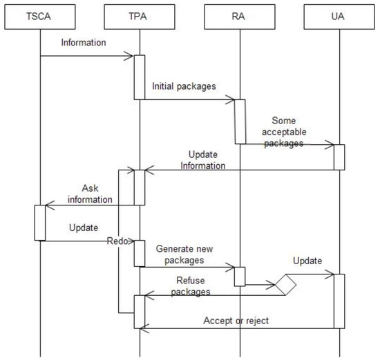 The TPA creates many types of tour packages according to the variations in the supply and demand of the holidays and tours. These package tours are based on real-time data that has been accumulated from the TSC and customer demand; similarly, a generation of each package tour can be developed for groups or individual customers. Each package is composed of a set of subtours and each customer is expected to like the package. A package contains the modality of the tour, i.e., departure date, price per person, duration, hotel type, and other relevant information. Agent-based technology creates real-time communication between the TPA and two other agents, such as the RA and the TSCA, in order to generate an exceptional package tour this communication on the MAS named as an ACL [65]. This communication is illustrated in the sequence diagram that is shown in Figure 2. From the sequence diagram, we assume that the customer has an initial package in the system, such as advertising-based package; after logging into the application and adding the related information, the updated version of the recommendation packages are sent to the customer’s profile.