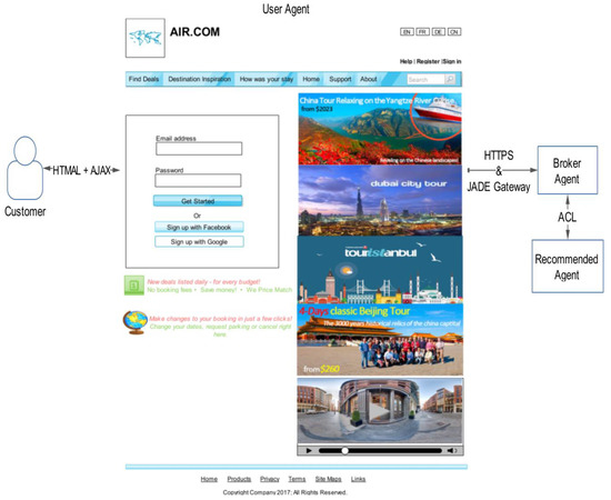 The UA is responsible for providing user interface to end user and hotel managers, it could run on a mobile device through a mobile app or on a website as a web application, enabling the customer to create an account and interact seamlessly with the software. The main aim of the UA is to provide a user interface to the customer by specifying the demographic and evaluation data that would assist in creating a user interface that executes the recommendation and purchasing process. The UA plays a key role in the communication process between the customer and the application. Also, it is vital for the updating of demographic data in the system. Therefore, it must be user-friendly and have high security. Interactions between customer through the UA and other agents are illustrated in Figure 3. The user interface was developed using HTML and AJAX, while the communication between other agents was developed using the HTTPS and JADE gateway.
