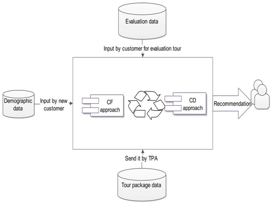 To determine the best-recommended packages for the customers, the proposed hybrid filtering approach was utilized, which included both the content-based and collaborative algorithms. Both algorithms enabled the recommended activities to be filtered with respect to their type, language, date of performance, recommended age, price, and supply chain, before being shown to the customer. In the proposed system, recommendations are made on demand and proactively. The first approach was the CB approach, which follows an association rule leaning towards obtaining knowledge about a customer’s preferences and to build on the content-based profile provided [22]. Association rule leaning is a rule-based machine learning method for discovering interesting relations between variables in the large databases. The second approach uses item-based collaborative filtering recommendation algorithms [68] to keep customers interested as well as to improve the customer’s satisfaction with the system. Recommendations and suggestions must be quick and agile by making sure each new response is updated on the recommendation model. In other words, the proposed system must be able to send a set of recommendations or suggestions within a certain timeframe. Consequently, in the proposed hybrid approach, both approaches (CF and CB) use a matrix Tn×n, where n is the number of tour packages and each tij ∈ T represents the total number of sub-items of tour i and j in the same tour package. RA updates the matrix in real time, whenever the data is updated. The RA checks all-possible rules i → j by considering the two values (P is the number of tour items in a tour package):