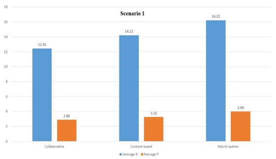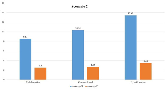 In the first scenario, we considered the TSC information from the tiers that did not change and supported all packages that existed on the system. Therefore, the proposed web application considered all the packages (70) during the recommendation process. For a better comparison, we used the average of the precision and recall, which was illustrated in Figure 5 and Figure 6. In the first scenario, the results show that the proposed system has a higher value on both indicators; the collaborative system produced 12.45 recalls and 2.89 precisions. Then, the content-based system produced 14.22 recalls and 3.23 precisions. Additionally, our proposed system produces approximately 16.23 recalls and 3.99 precisions. These results show that the proposed system performs better than the other systems, which improve the rate of acceptable recommendation tour packages based on the customer request. In the second scenario, 5 packages were canceled. The TPA deleted these packages from the RA databases; as a result, these databases were updated, with respect to this disturbance and 65 packages instead of 70 packages were used. Figure 6 shows the average of the indicators, illustrating that the proposed system in scenario 2 had higher values in both results (R = 13.41 and P = 3.43) and performed better than the conventional system.