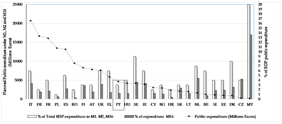 Target of RDP in expenditure under Measure: M1; M2 and M16 in value and percentage of RDP public expenditure. Source: Adapted from RDP [31].