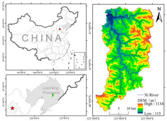 The Xihe River Basin is located in Liaoning Province, China, between 40°45′ N–41°00′ N and 123°40′ E–124°00′ E. It is a tributary of Taizi River, with a length of 200.737 km, and a drainage area of 1111 km2. The Xihe River basin has a typical temperate monsoon climate, characterized by hot, rainy summers, and cold, dry winters. The terrain of the river basin is higher in the east and south, and lower in the west and north. The downstream mainly lies in plain areas (Figure 1).