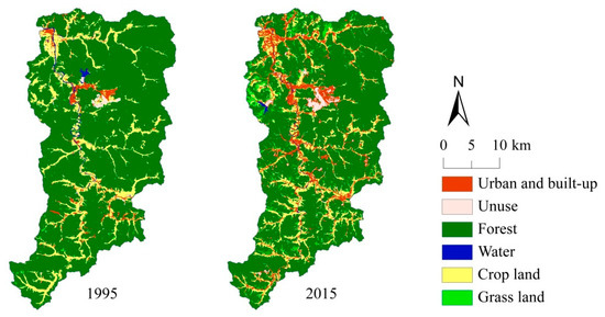 The land use maps of Xihe River Basin in 1995 and 2015.
