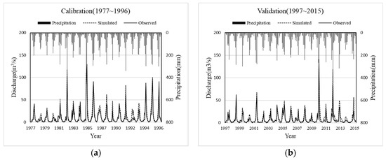 Comparison of (a) simulated and (b) observed values of monthly runoff in calibration and validation periods.