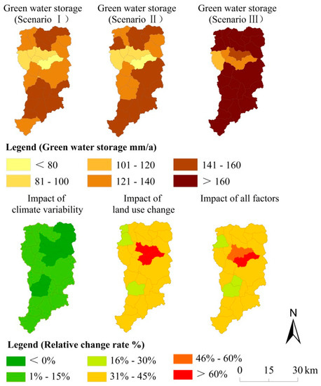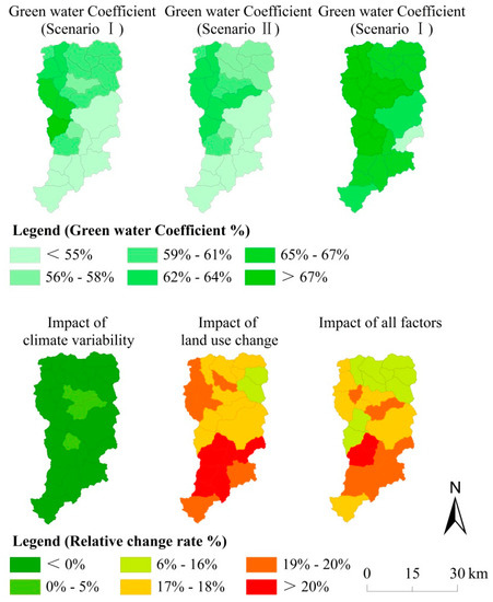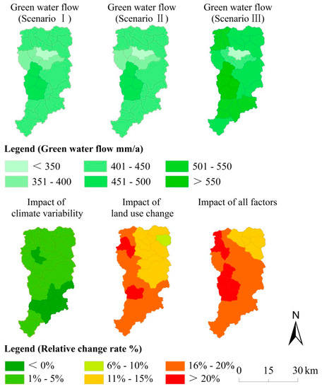 The simulation results show that the green water coefficients in Scenario I, II, and III were 59%, 58%, and 68%, respectively. The green water coefficient increased by 9% under the combined influence of climate variability and land use change (Scenario III–Scenario I). Climate variability (Scenario II–Scenario I) accounted for a decrease of 1% in the green water coefficient. On the contrary, land use change (Scenario III–Scenario I) accounted for an increase of 10%.