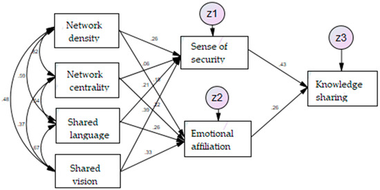 To prove the first premise, we took network density, network centrality, shared language, and shared vision as independent variables, with knowledge-sharing as a dependent variable. The test showed that the R value was 0.506, the dependent variable’s explanation degree amounted to 50.6%, the F value tested in the regression analysis was 88.125, and the p value was smaller than 0.01. These data indicate that the established regression model had a high degree of fitting. The regression coefficients of shared language and vision were 0.231 and 0.518 respectively, T values were 4.398 and 10.042 respectively, and the corresponding p values were both smaller than 0.01. These findings prove that shared language and vision both exert a positive impact on knowledge-sharing, and that their impact was rather significant. Whereas, the regression coefficients of network density and network centrality were 0.027 and −0.026 respectively, and the corresponding p values were 0.587 and 0.479, indicating that network density and centrality have no significant positive impact on knowledge-sharing. Table 3 proves the second and third premises. Finally, the regression analysis was applied to the fourth premise. The test showed that when the sense of security and emotional affiliation served as mediating variables, the regression coefficients of shared language and vision (two dimensions of social capital) for knowledge-sharing declined, but the p value was smaller than 0.01. In conclusion, under the mediating impact, the influence of shared language and vision was significant. Pan-family consciousness still had a significant, positive impact on knowledge-sharing, and the absolute regression coefficients of the two dimensions of social capital under mediating function were smaller than those under direct influence. Indicating that pan-family consciousness plays an intermediate role, to some extent, between cognitive capital (shared language and vision) and knowledge-sharing. However, pan-family consciousness did not behave as an intermediate between structural capital (network density and network centrality) and knowledge-sharing. Therefore, H6 partially passed the test.