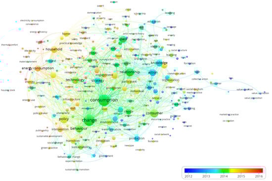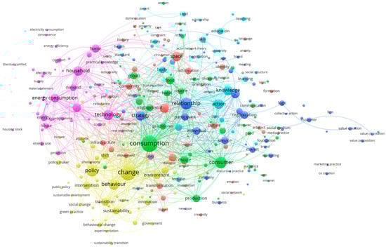 From a theoretical perspective, it is evident from the term map how practice theoretic approaches in consumer studies have bridged to other theoretical frameworks. There are, indeed, several references to technology and innovation (respectively on the central and lower part of the maps). This shows how some scholars link practice theories to different aspects of sociotechnological transitions [7,9,70,78], or study how interconnected practices play into sociotechnological change [8,43]. In this domain, links have also been created between theories of practice and transition theories, which study transitions in sociotechnological systems [73,79,80]. Other authors also focus on technology, but emphasise the agentive aspects of technology in the reproduction of practices, and on how technologies are embedded in practices [7,11,16,81]. However, still under this theoretical perspective, surprisingly both in the term maps (Figure 1 and Figure 2) and in the co-citation map (Figure 3) only very few links could be found to the theory of reasoned action [82] or the theory of planned behaviour [33] that are often used as framework to analyse sustainable behaviours related to consumption.