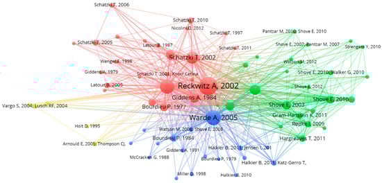 In order to obtain a deeper understanding of how interlinkages between theories of practice are operationalised in different knowledge fields, a document co-citation analysis is conducted. Co-citation analysis is an effective method for discovering the intellectual structure of research domains and its deployment makes it possible to measure similarities between documents by means of citation relationships [52,53]. Co-citation was firstly defined by Small [54] as the “frequency with which two documents are cited together by other documents”. A co-citation exists when two references appear together in the same publication and the more co-citations two documents have, the higher the degree of similarity between them [54,55].