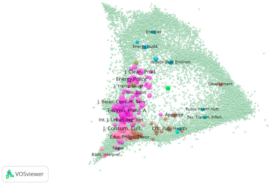 Moreover, in order to further explore the interrelation in this field of research we produced a map showing the journals containing the 1519 academic papers plotted on a global map of science (Figure 4). As presented in the map, most of academic researches related to social practice theory were made in journals dealing with psychology and social science, economic and management and environmental sciences. Only a smaller number of publications were made in journals related to human health-related journals. The scarce interdisciplinarity of the area of research is also confirmed by the Rao–Stirling diversity index [60,61,62] of 0.11.