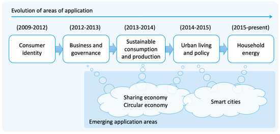 Figure 2 shows how the application of SPT in research domains has varied over time. The first applications appear to be in domains related to pure business-related aspects, in blue colour, in 2012. More in detail, social practice theory research in this period contributes mainly to the discussion on the relationship between identity and consumption [67,68] and the dynamics and transitions of practices in everyday life [69,70]. Then, in 2013, SPT was stated to be applied to innovation issues, marketing research and business strategy. There are several studies dealing with strategic and innovation management theories and applications [71,72,73] and applied marketing research [74,75].
