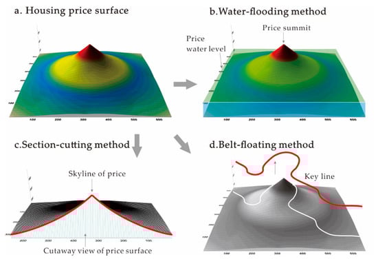 In order to visualize the analysis results and make them easier for understanding, we develop a novel approach by referring to the DEM and DTM-based analysis methods in geoscience, such as the river cross-section in flood model [65,66] and the terrain model for floodplain mapping [67]. We assume the housing price surface can be expressed as f(x, y, z). By integrating different modules in ArcGIS and ArcScene, we propose the DEM-based analysis methods as follows: