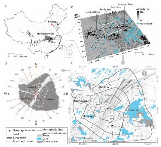 Location of Wuhan city in China (a); and topographical map (b); spatial element distribution (c) and spatial pattern setting (d) of the study area (Note: Figure 2b was based on SRTM 90 m-resolution elevation data provided by the Consortium for Spatial Information, srtm.csi.cgiar.org. Figure 2c was collected from an online map (map.baidu.com). Figure 2d shows the division of sectors in downtown Wuhan by 15° intervals, with the GC as the center and the loop as the scale; 360, 345, 330, 255, 240, 225, 150, 135, and 120 in Figure 2d are main concerns in the empirical analysis).