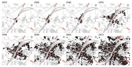 Wuhan is located in the middle reaches of the Yangtze River and its largest tributary, the Hanshui River, which pass through the city [68]. There are a large number of lakes in the urban area of Wuhan, including China’s largest urban lake, East Lake. Therefore, Wuhan is known as a “river city” and “city of lakes” (see Figure 2). Over the past century, Wuhan has been growing, with the intersection of the Yangtze River and the Hanshui River as the core (see Figure 3). The landscape of the city has gradually evolved from a monocentric mode to a polycentric mode. At present, the landscape of Wuhan City has the following characteristics [42]: (1) Urban ring roads form a basic framework with a radioactive structure; (2) multiple centers have made up an intensive road network area within the inner ring road; (3) different urban areas have gradually built respective sub-centers, constrained by natural geographic and environmental conditions. Figure 2a shows the location, topographical map, and study area of Wuhan City. The study area is mainly the central urban area of the city. For the study area, we have built the GIS analysis environment (see Figure 2c), including ring road, subway line, trunk road, water body, green land, and other geographic elements, based on the Open Platform of Baidu Map (lbsyun.baidu.com) and with reference to Wuhan City’s spatial regulation and implementation planning for urban development area and the city’s subway construction planning (www.whrt.gov.cn).