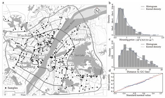 Global spatial autocorrelation reflects the spatial characteristics of an attribute across the whole area and indicates whether there exists an evident correlation between the attribute information and its location. The spatial autocorrelation theory is usually applied in the fields of spatial economics and geo-statistics [70,71,72,73]. The Moran’s I Index, which is used to measure the correlation among spatial elements, is a correlation coefficient that is widely used to test the global spatial correlation [74]. After correction, the Moran’s I Index of commodity house price is 0.29 for the selected samples, with an expectancy value of −0.007, a Z test value of 7.964, and a p value below 0.01. With a confidence level of 99%, the multiple Z test value reflecting the standard deviation is above 2.5. Therefore, we can deny the null assumption that the random distribution of observed values and conclude that the housing price attributes of these observed samples are spatially correlated with one another. Besides, we employed a frequency distribution curve to test the sample’s normality and eliminate abnormal data points. Based on the quantile–quantile (Q-Q) plot (see Figure 4d) of the housing prices from 386 samples that follow a lognormal distribution, we removed luxury houses (such as villas) and affordable housing (policy-related house). Finally, the 318 remaining samples (positions), including 313,230 housing units (covering an area of about 32.26 million square meters), were used for geo–visual analysis (see Figure 4a).