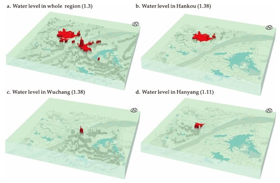 Housing prices DEM under different scenarios with fluctuating “water levels” (Note: “water level” uses the unit selling price in 104 CNY ¥ ▪ m−2; (a) displays the global scope of the study area under the water level of 1.3; (b–d) represent Hankou Sector and Wuchang Sector under the water level of 1.38 as well as Hanyang Sector under the water level of 1.11).