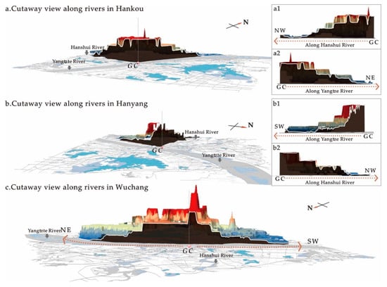 We cut along the section of the DEM surface for housing price in Wuhan City in the tri-dimensional spatial environment, obtained side-view morphological characteristics of the housing price surface in a given direction, and analyzed the gradient changes. Under the spatial landscape of Wuhan City, the Yangtze River and the Hanshui River are important geographical factors that influence the urban spatial landscape and can be considered as the key directions for spatial change characteristics of the housing price. By implementing the cutting process in ArcGIS, we got the side-view characteristic patterns of the housing price surfaces of Hankou, Hanyang, and Wuchang along the rivers. All side views present a similar trend of housing price variance: the housing price decreases with the distance increases from the GC. For example, the price decreases from the GC to the northwest direction (Figure 7a1) and from the GC to the northeast direction (Figure 7a2) in Hankou, and the price declines from the GC to the southwest direction (Figure 7b1) and from the GC to the northwest direction (Figure 7b2) in Hanyang; the price decreases from the GC to the northeast and the southwest direction (Figure 7c) in Wuchang. As for the overall gradient decline pattern, the housing prices fluctuate in any direction (Figure 7b1). Additionally, after all the sections are blackened, we can further analyze the price relationship between the riverfront areas and other areas from the horizontal side view. If the remote price surface is covered by the black section in the side view, this means the housing price in the riverfront areas stays at a higher level (Figure 7b2).