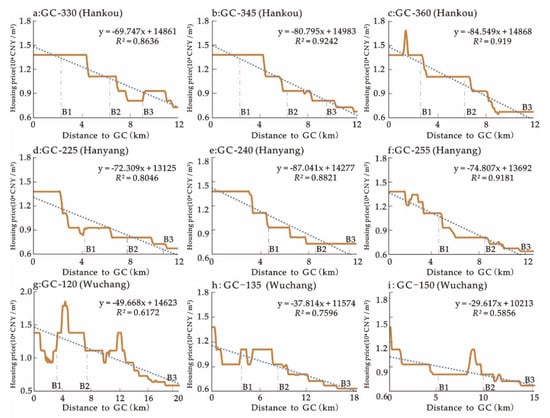 To make a further quantitative analysis of the gradient change of the housing price surface in different directions, we observe the housing price changes when the distances from the GC rises. We define the GC as the starting point, selecting different directions and cutting the cross-sections of the DEM, according to the spatial landscape division and definition mentioned above. On the principle of typicality and maximum assurance of spatial continuity, we selected three representative directions in Hankou, Hanyang, and Wuchang (HK Sector: GC-330, GC-345, and GC-360; HY Sector: GC-225, GC-240, and GC-255; and WC Sector: GC-120, GC-135, and GC-150).