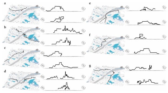 Figure 9. Spatial morphology of subway lines floating in housing price DEM (Note: (a–g) relate to subway lines 1–7, including completed and under construction, in Wuhan City). - (2)