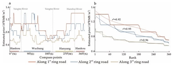 - Investigation of housing prices along subway lines. Considering the radioactive landscape of Wuhan City, we collected the price data on the DEM surface relating to different ring roads within the central urban area and compared these data. Through investigating the housing prices along different ring roads in different directions, we found that the prices tend to decrease from the first ring road to the third ring road in Hankou and Hanyang (see Figure 10a), which fits the radioactive spatial structure feature of Wuhan City. However, the housing price in Wuchang does not show a similar pattern. In some directions in Wuchang, the housing prices along the ring roads do not show a hierarchical distribution but display a fluctuation pattern. This feature is contrary to the spatial structure feature, but corresponding with the polycentric trends of the housing price morphology, as explored earlier. Besides, if sequenced from high to low along the ring roads, the housing prices also present an overall decline trend from first ring road to third ring road (see Figure 10b).