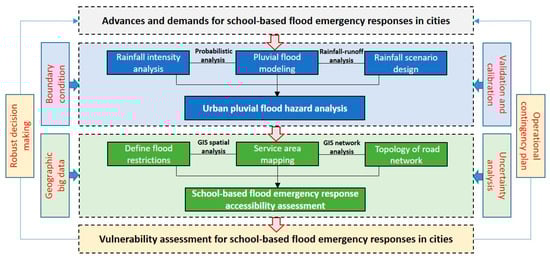 This study employs recent advances in flood scenario analysis and spatial accessibility mapping to develop a framework for the vulnerability assessment of school-based flood emergency response in cities. A preliminary overview of the conceptual framework is shown in Figure 1. This contextual picture emphasizes on evaluating operational responses from emergency nodes to schools and students under normal and pluvial flood conditions. Based on adequate knowledge, attitude, coordination and communication between schools and responders, we establish the core concept of school flood emergency management demands [32]. We firstly compile comprehensive, up-to-date and accurate information regarding urban pluvial flooding (e.g., extent and depth) through probability analysis and rainfall-runoff modeling. After identification of flood restrictions for road network, emergency response accessibility to schools can be mapped under no flood and flood scenarios by using big data and GIS network analysis. Next, school vulnerability in terms of flood emergency services can be assessed according to the responses times. Finally, the operational contingency plan should be formulated to provide robust decision making support for policy makers, school headmasters, emergency responders and other concerned stakeholders.