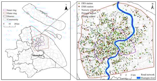 The study area has been the downtown part of the city historically and thus consists of a typical urban patterns such as heavy traffic, crowded buildings and extensive imperviousness. Most of the schools and over 2.5 million students distribute within the city’s outer ring. There are 2020 schools scattered in both the inner and outer ring, accounting for 61% of the total in Greater Shanghai. Among the target schools, 964 (47.7%) are nursery schools, 488 (24.2%) are primary schools and 568 (28.1%) are middle schools. Moreover, a total of 57 EMS stations and 61 fire houses across the study area provide emergency services for all schools and students. The location map of schools and responders is shown in Figure 2.