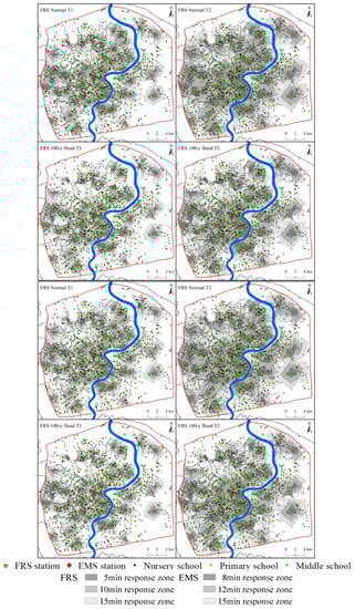 EMS and FRS to schools within specific timeframes under normal and 100-y flood scenarios have been presented and summarized in Figure 3 and Table 1, respectively. Results show that under no-flood condition, all schools in the study site are expected to be accessible for emergency responses. Although EMS and FRS could reach most of the schools in 15 min, the targets of emergency response would not be completely achievable even when operating under normal conditions. This can be principally attributed to uneven distribution of emergency stations and some notable “blind spots” of emergency services. These can be observed in the northern and western parts of the study area which generally are the rural-urban fringe zones. Another important finding is that traffic conditions exert a significant impact on daily emergency responses to schools. Compared with EMS and FRS coverages in daytime, emergency service to schools in rush hours are shown to experience a 10–30% reduction in response areas. Despite less stations, EMS is predicted to provide more service coverages for schools than FRS. This is due to its relatively strategic positioning over the central Shanghai. In addition, emergency provisions to nursery schools are slightly less than those for primary and middle schools.