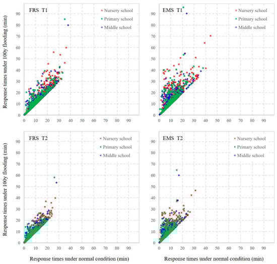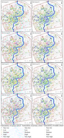 The vulnerability ranking of emergency response to schools under normal and flood condition are illustrated in Figure 4. It can be found that under normal no-flood condition, schools located in the traditional and mature communities of downtown are mostly classified as very low or low vulnerability as emergency stations have been strategically placed to provide sufficient coverages. By contrast, emergency responses would be less accessible to schools in the new urbanized areas (e.g., periphery of outer ring) where a variety of facilities and public services have not been well established. However, the school vulnerability show variations in spatial distribution in 100-y flood scenario. Due to the flood impacts on emergency provisions, a large number of schools would experience significant increases in vulnerabilities, particularly in the city center such as Lujiazui financial district. A comparison of modeled response times under normal and 100-y flood scenarios shown in Figure 5 also confirms the visual inspection in Figure 3 and Figure 4. Significant deviations in the modelled response times can be clearly observed between normal and 100-y flood scenarios, especially in terms of EMS and in rush hours (T1). The impact in terms of response time is generally proportionate to the magnitude of flood event. It is found that 100-y pluvial flooding would lead to on average 1–3 min delay in the travel times of emergency responses to schools. The primary schools would be most severely affected by the flooding in terms of travel delay and the nursery schools take second place. For example, compared to normal condition, the average response times to the primary schools are shown to increase by 2.8 min with a maximum delay of 75 min in rush hours when 100-y flood restrictions are presented.