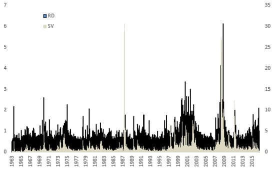 Figure 1 presents the time series plots for daily equity return dispersion (RD) and stock market volatility (SV) during the sample period. Not surprisingly, we observe several notable spikes in both series, particularly during the Asian crisis period in the late 1990s and the global financial crisis periods, in line with the previous studies associating high stock market volatility with recessionary periods and periods of market stress [,]. It is interesting that return dispersion values also exhibit similar spikes during these periods. Demirer et al. [] note that these periods were also associated with spikes observed in the level of global risk aversion, driving equity market correlations higher globally. To that end, the high level of equity return dispersion observed in Figure 1 during periods when stock market volatility also rises suggests that these two series are possibly driven by a common fundamental factor related to the economy.