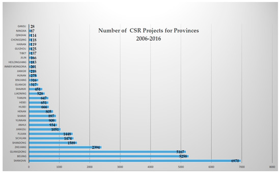 As a second contribution, this study sets up a company-level analysis, using a unique database that records all the corporate environmental disclosures in China from 2006 to 2016. We filter projects (for CSR initiatives) and then sort them by company. The data set for this period includes over 34,000 CSR projects released by 839 companies in China. Based on our research, this is the first study that collects and analyzes company-level CSR and corporate data in accordance with the latest financial studies [49]. This research provides new findings for previous literature [50,51] about the impact of CSR on company performance.