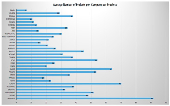 Second, we analyzed data across the 31 province-level divisions in China (excluding Hong Kong, Macau, and Taiwan). We sorted all involved companies by the province where their registered locations are, and then categorized companies’ projects by province. As shown in Figure 2, as representative of the modern China, companies in Shanghai had almost 7000 projects since 2006. By contrast, there were only 28 projects by companies located in Gansu Province. The difference is associated with inequality in socioeconomic dimensions of these two provinces. Furthermore, as indicated in Figure 3, Shanghai managed to rank first with an average number of 92 projects per company, compared to Gansu with an average of 7. Both figures depict the spatial and geographic unevenness of companies’ efforts toward addressing environmental and social responsibility projects. These results show the impact of companies’ participation on CSR adoption in different provinces (regions with different socioeconomic systems). For example, companies in developed regions (e.g., Shanghai, Beijing, and Guangdong provinces) have either more resources or larger incentives to undertake environmental and social responsibility projects than companies in less-developed regions.
