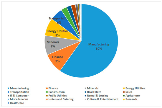 The results indicate that project proportions differ largely across industry type. As shown in Figure 4, the top five industries with the largest numbers of projects are manufacturing (60%), followed by finance (9%), minerals (8%), energy utilities (8%), and transportation (6%). These industries occupy 91% of the entire pool. The other 12 industries occupy the remaining 9%, including construction, real estate, sales, IT & computer, public utilities, rental & leasing, agriculture, hotels & catering, culture & entertainment, research, healthcare service, and others listed as miscellaneous.