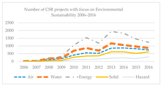 Figure 5 depicts the trend of CSR projects for each context between 2006 and 2016. The figure clearly shows a sharp increase in the number of environmental sustainability projects in the areas of energy, water, and air management between 2007 and 2013 (similar to Figure 1). As an interesting finding, CSR projects concerned with solid and hazardous wastes show an increase in 2015 and 2016. This increase can be attributed to the enforcement of government regulatory requirements to reduce generation of hazardous material in industrial environments.