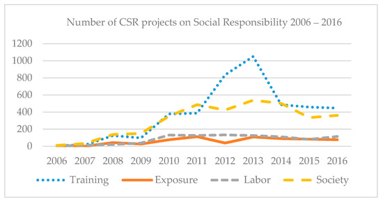 We first observed the development of CSR projects through company projects. Figure 1 depicts the number of CSR projects reported by companies in China between 2006 and 2016. Chinese companies adopted CSR projects between 2006 and 2013 with increasing rates. The trend, however, decreased after 2013, resulting in 4167 projects in 2016. The upward trend between 2006 and 2013 was associated with the development of environmental sustainability, such as the encouragement of cleaner production by the Chinese government in 2013. The decreasing trend after 2013 was associated with the increase in the costs of the projects and the decrease of financial supports from the government and other sources.