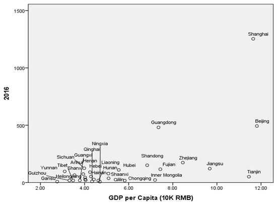 As observed before, the location where companies operate is a key factor that influences the CSR initiatives. As a further investigation of the correlation between CSR initiatives and locations, we sorted the 31 province-level divisions by their GDPs per capita. The correlations are depicted in Figure 7. Shanghai, Beijing, and Guangdong, whose GDPs per capita are leading among Chinese provinces and cities, show a higher CSR initiative level in year 2016.