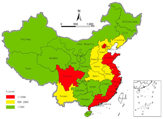 Corporate geographic dispersion plays a significant role with respect to enterprise value and profitability [55,56,57,58]. In order to investigate the potentially diverse impact of environmental and social responsibility projects across different geographic regions of China, we classify the 31 province-level divisions in China into three regions according to their aggregate numbers of projects in Figure 2. For divisions with over 1000 environmental and social responsibility specific-related announcements, we define them as high-CSR regions; for divisions with CSR-related announcements between 500 and 1000, we define them as mid-CSR regions; for divisions with fewer than 500 CSR-related announcements, we define them as low-CSR regions. The distribution map of the three regions is presented in Figure 8.
