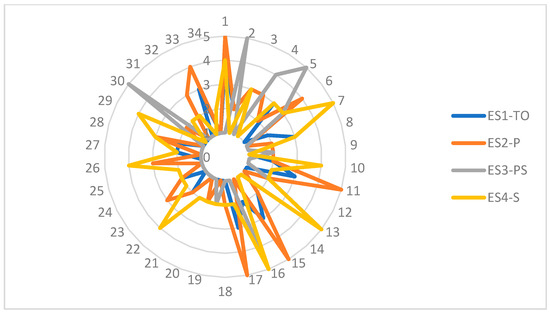 In this framework, the analysis was based on crosstab queries and radar charts in order to map the strategies disclosed. The contingency tables considered allowed to observe relationships that were not easy to notice otherwise and that also could not be identified through some statistical investigation, such as the one offered by EViews, due to the small sample available.