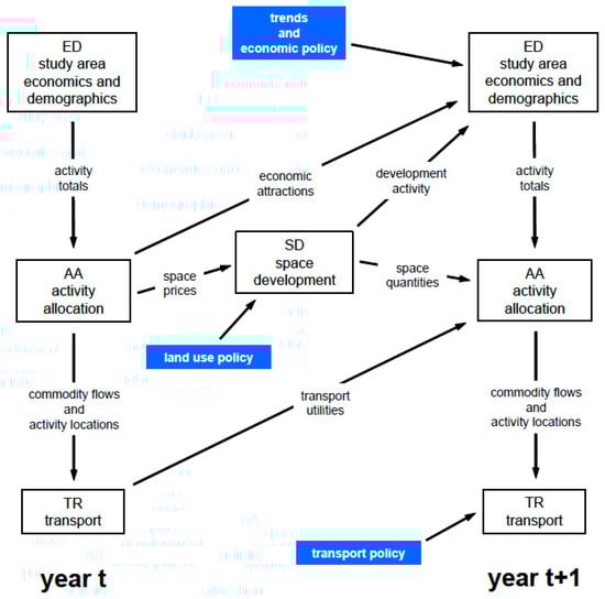 PECAS is a generalization of the spatial I/O modeling approach used in the MEPLAN and TRANUS land use transport modeling systems. Both the “integrated” structure and the “connected” structure can be set up in PECAS. In an integrated model, the land use component feeds the spatial distribution of flows of economic interactions between zones as origin and destination movements into the transport component, and the transport module performs the remaining steps. However, the transport component of a connected model performs the four classical steps, including trip distribution. Compared with a connected structure, the integrated option assures the best integration of the two components and avoids inconsistency in the use of an origin to destination (O-D) matrix. When a fully fledged, four-step model is in place, a connected structure can be easily set up to run the land use and transport models concurrently. An integrated structure can be developed over a long run when resources and opportunities permit. Depending on its design and purposes, the PECAS model usually consists of the following modules: Economy and Demographics Forecasting (ED module), Activity Allocation (AA module), Space Development (SD module), and the Transport model, as shown in Figure 2 []. The ED module is used to develop aggregate economic forecasts for the studied area. The AA module represents how activities locate within the space provided and how these activities interact with each other at a given time, which is an aggregate representation based on spatially disaggregated forms of extended input–output tables. The SD module represents the actions of developers in the provision of space where activities can locate. The Transport model represents the transport system connecting locations. The travel conditions—distances, costs, times, and associated disutilities by mode—for the movement of different commodities (services, goods, or labor) are how the transportation system influences the attractiveness of zones as locations for different activities. When a transport investment is made, the travel conditions will be changed, resulting in changes in the attractiveness of locations and the corresponding quantities of activities at them.