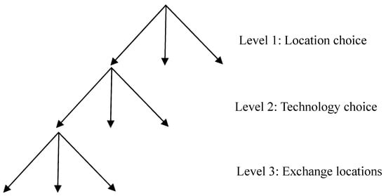 The PECAS AA module applies three-level nested logit models to represent the choice of location, production–consumption options (called “technology”), and quantities of buying or selling of different activities at exchange locations, as shown in Figure 3.